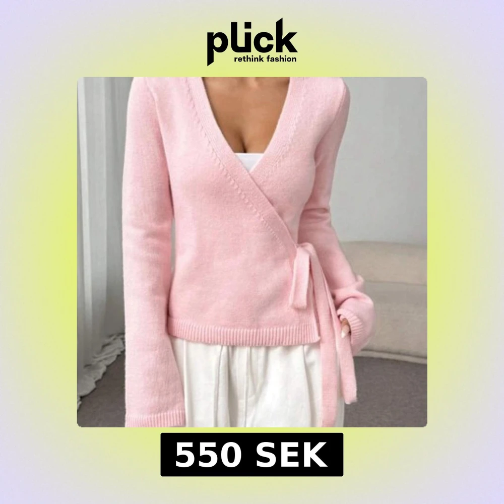 Superfin ljusrosa omlottkofta med knytband i midjan och v-ringad hals. Koftan är stickad och har långa ärmar samt ribbade muddar. Perfekt för lager-på-lager och ger en söt och mjuk look.