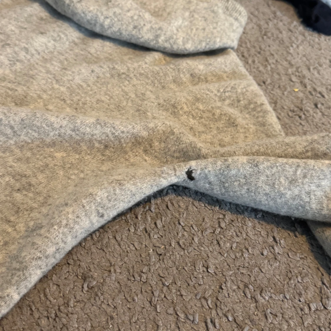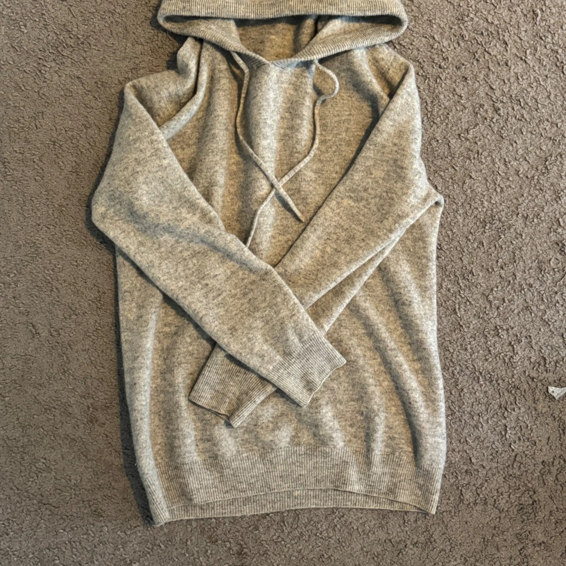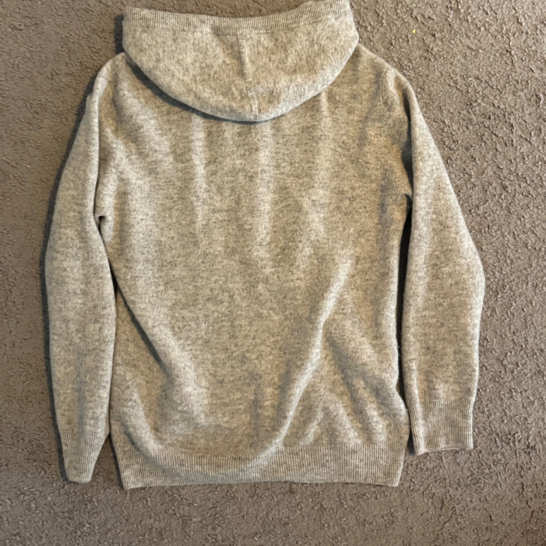 Mysig grå hoodie i stickat material med huva och snörning framtill. Tröjan har långa ärmar och ribbade muddar vid ärmslut och nederkant. Perfekt för kyliga dagar och enkel att matcha med jeans eller mjukisbyxor. Men har tyvärr att hål under armen men syns inte alls