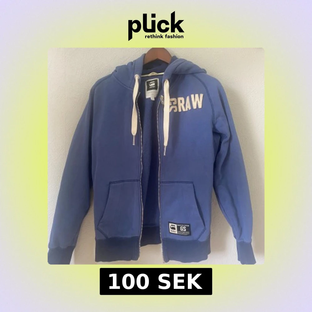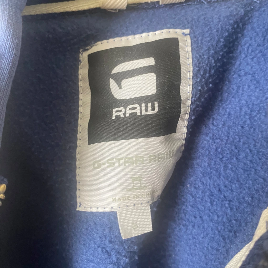 Blå hoodie från G-Star RAW med vit broderad logga på bröstet, dragkedja framtill och stora fickor. Tröjan har vit snörning i huvan och ribbade muddar. Perfekt för dig som gillar streetwear och vill ha en chill look.