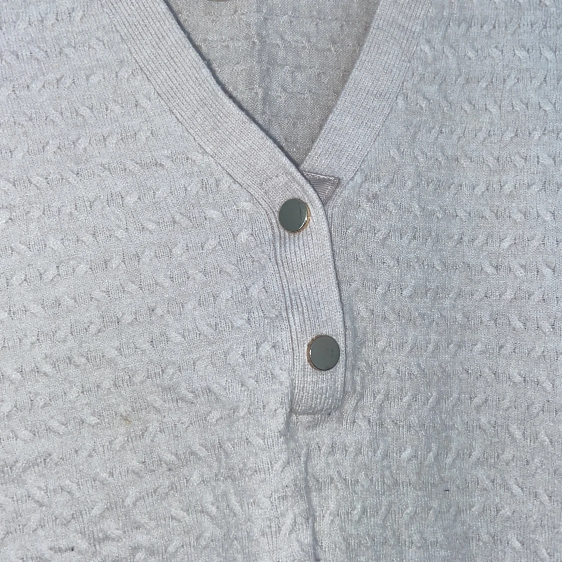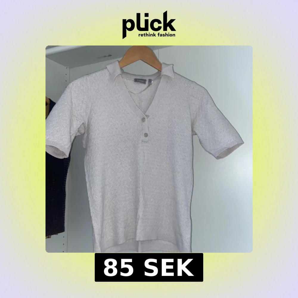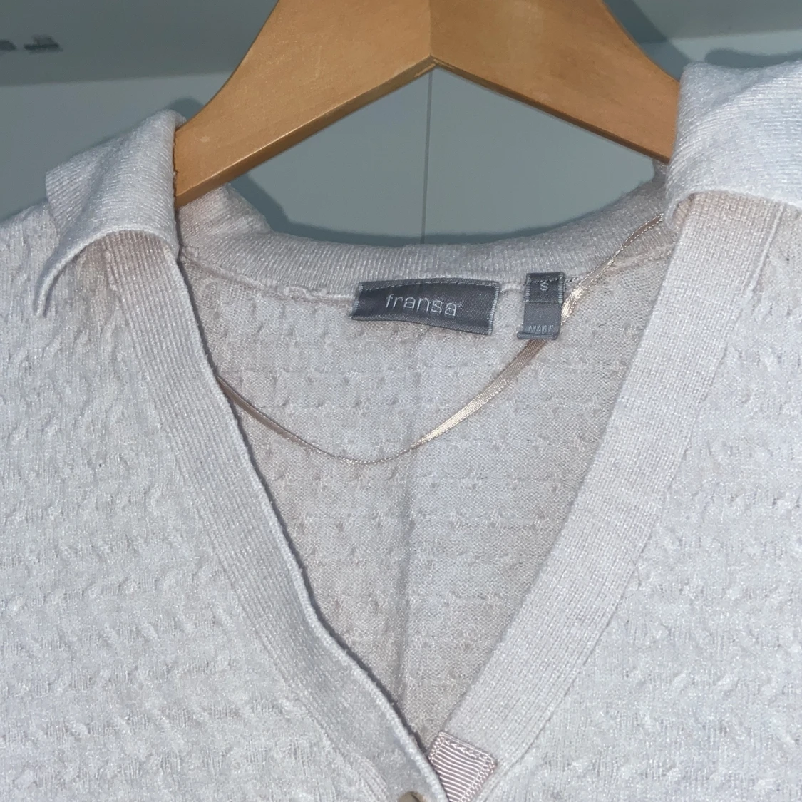 Säljer en stilren vit kortärmad tröja från Fransa. Tröjan har en v-ringad design med knappar framtill och ett diskret mönster. Perfekt för en avslappnad look.
