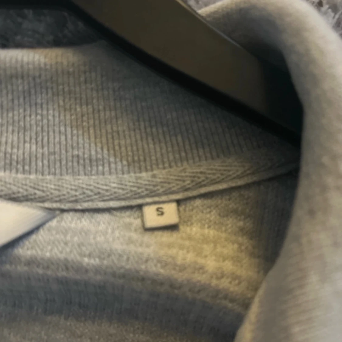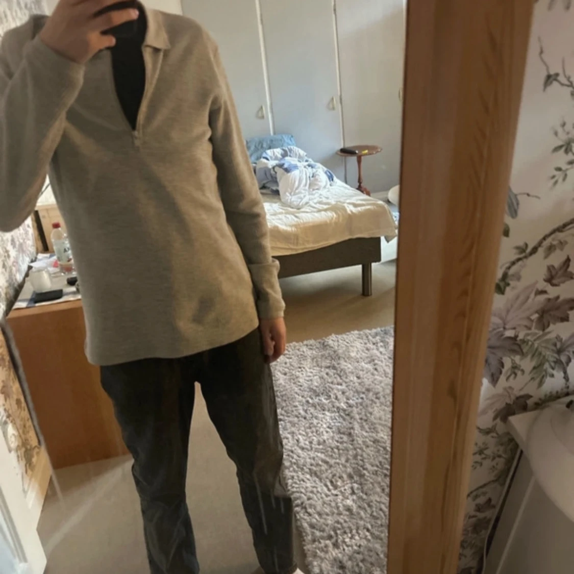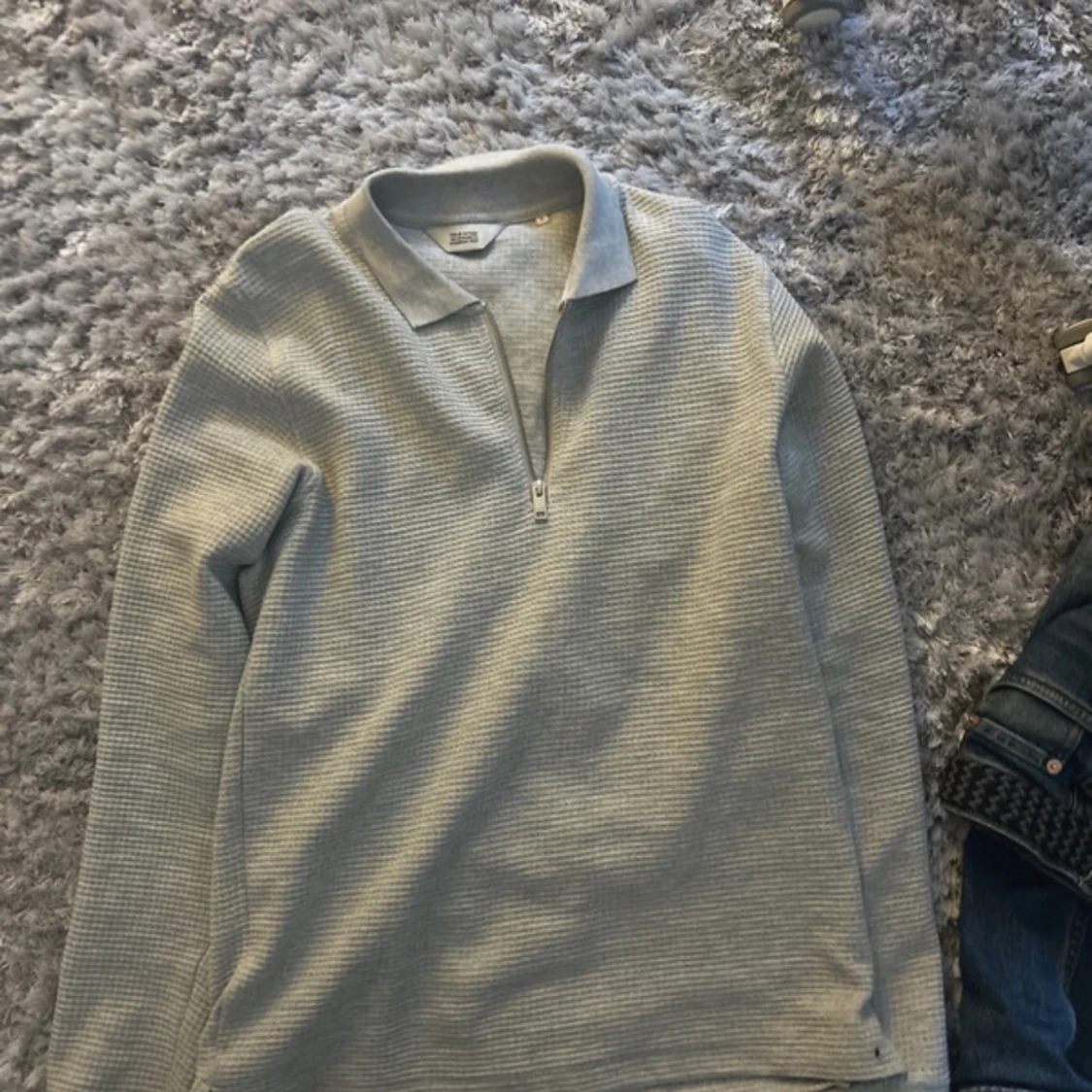 Säljer en stilren grå långärmad tröja med dragkedja vid halsen. Tröjan har en klassisk krage och är perfekt för en avslappnad look. Den är i en mjuk och bekväm kvalitet. Har inga defekter och är som helt ny