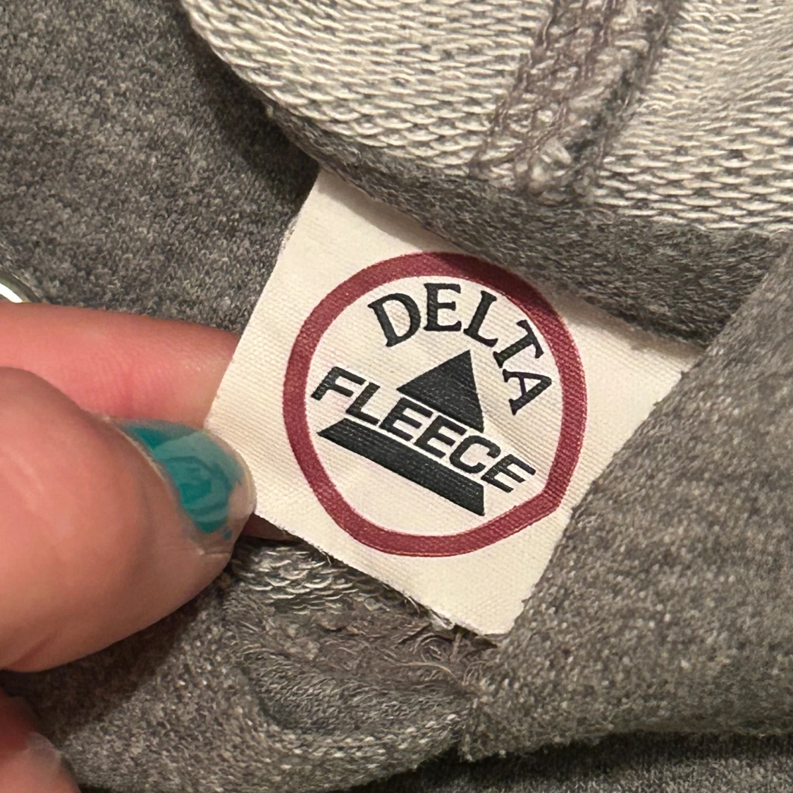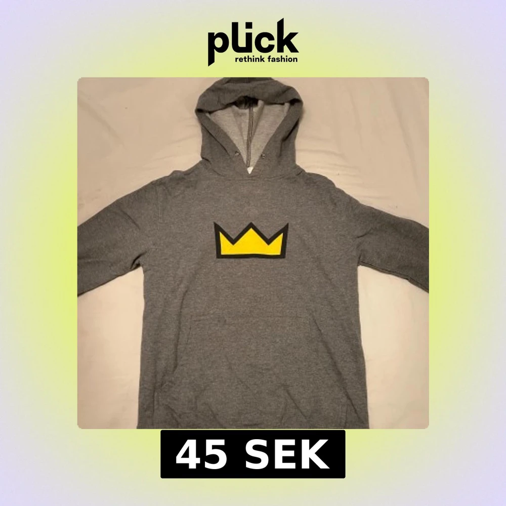Grå hoodie från Delta Fleece med en stor gul krona tryckt på bröstet. Vet inte storlek men skulle gissa på S