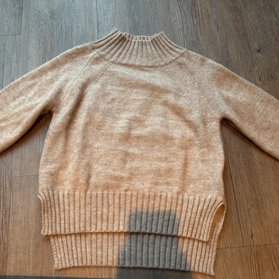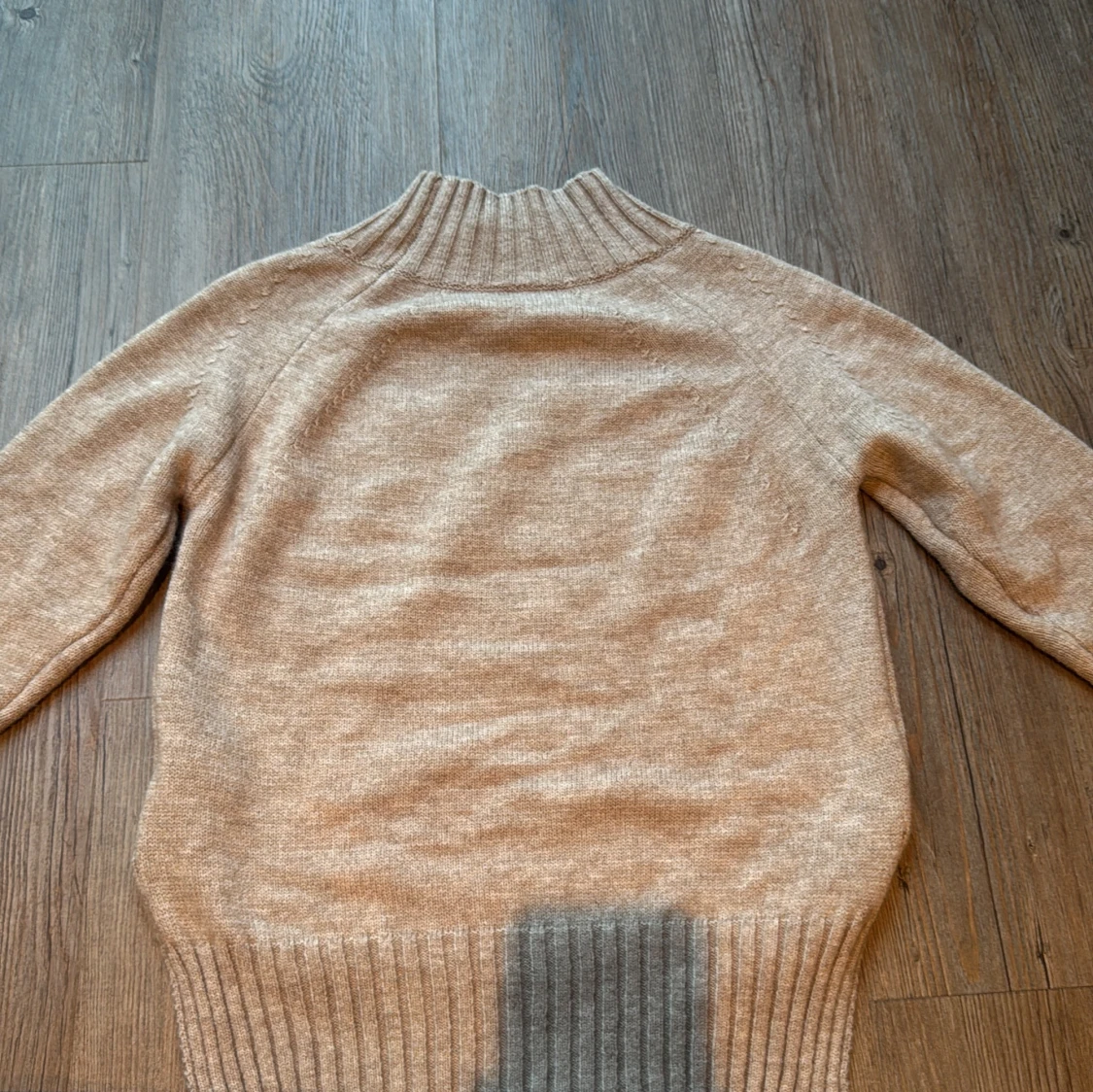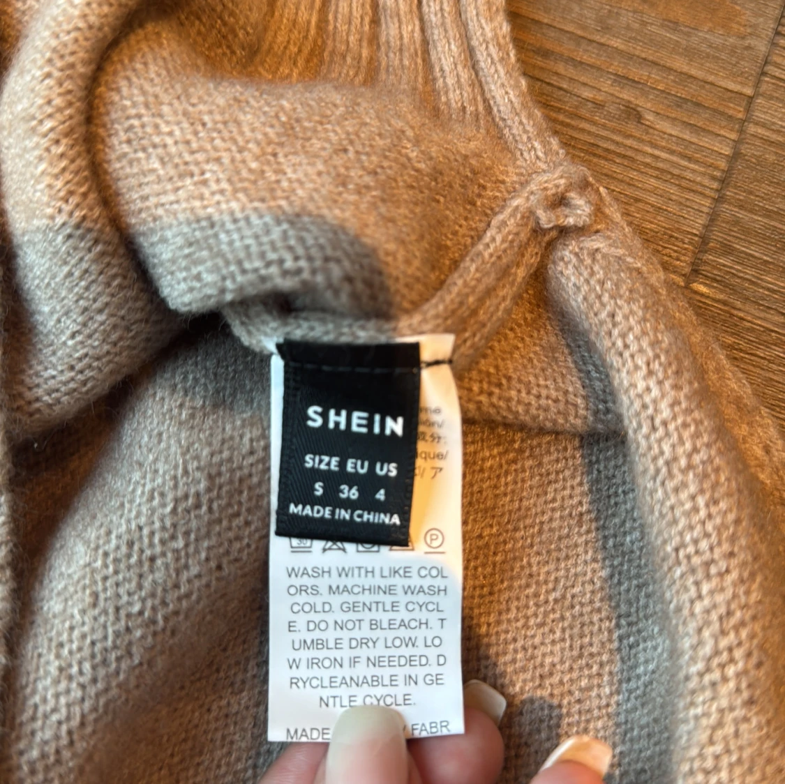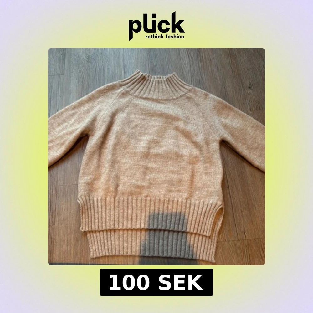 Säljer en beige stickad polotröja från Shein i storlek S. Tröjan har en hög ribbad krage och breda ribbade muddar vid nederkant och ärmslut. Perfekt för dig som gillar en enkel och clean look med lite oversized känsla.