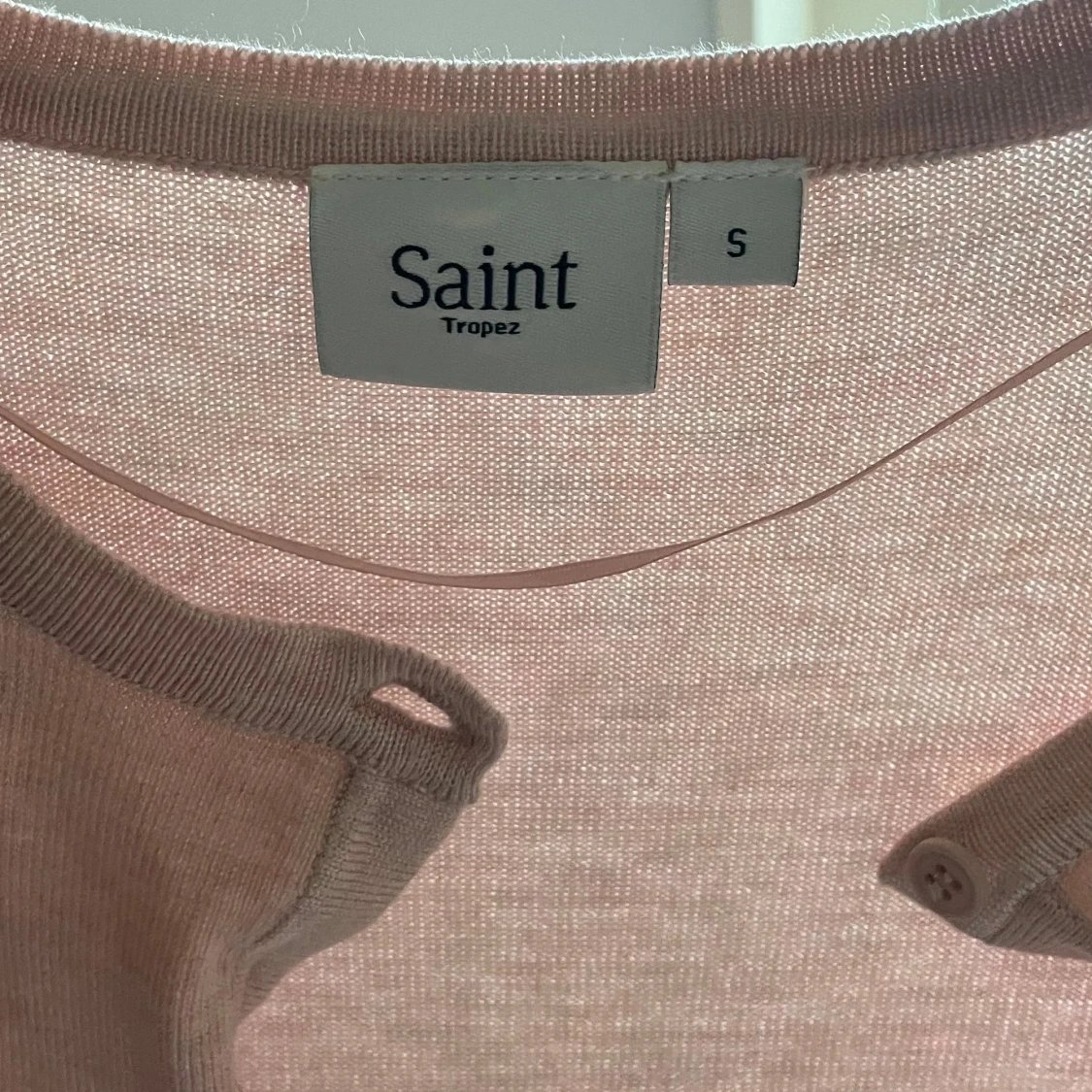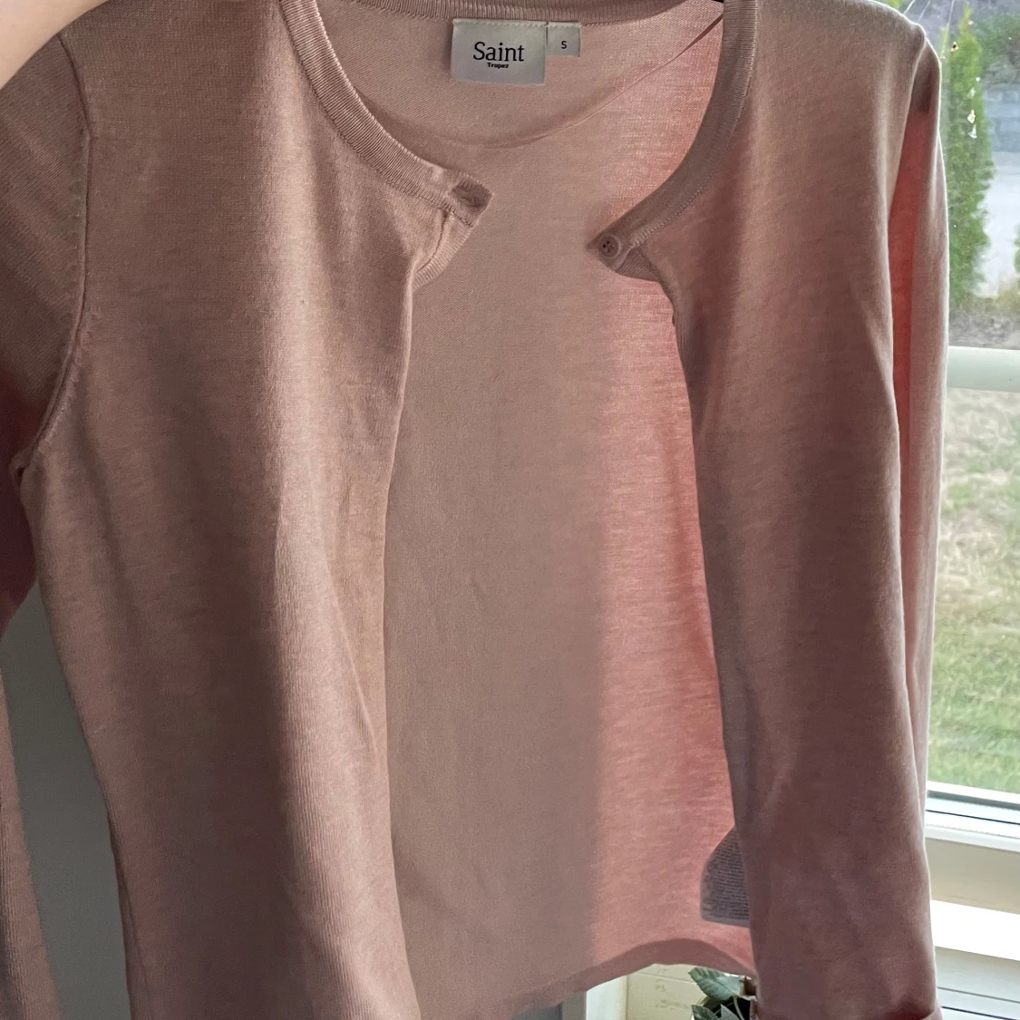 Säljer en ljusrosa kofta från Saint Tropez i storlek S. Koftan har rund hals, långa ärmar och knappar framtill. Materialet är mjukt och tunt, perfekt för lager-på-lager. Enkel och stilren design som funkar till många olika outfits.
