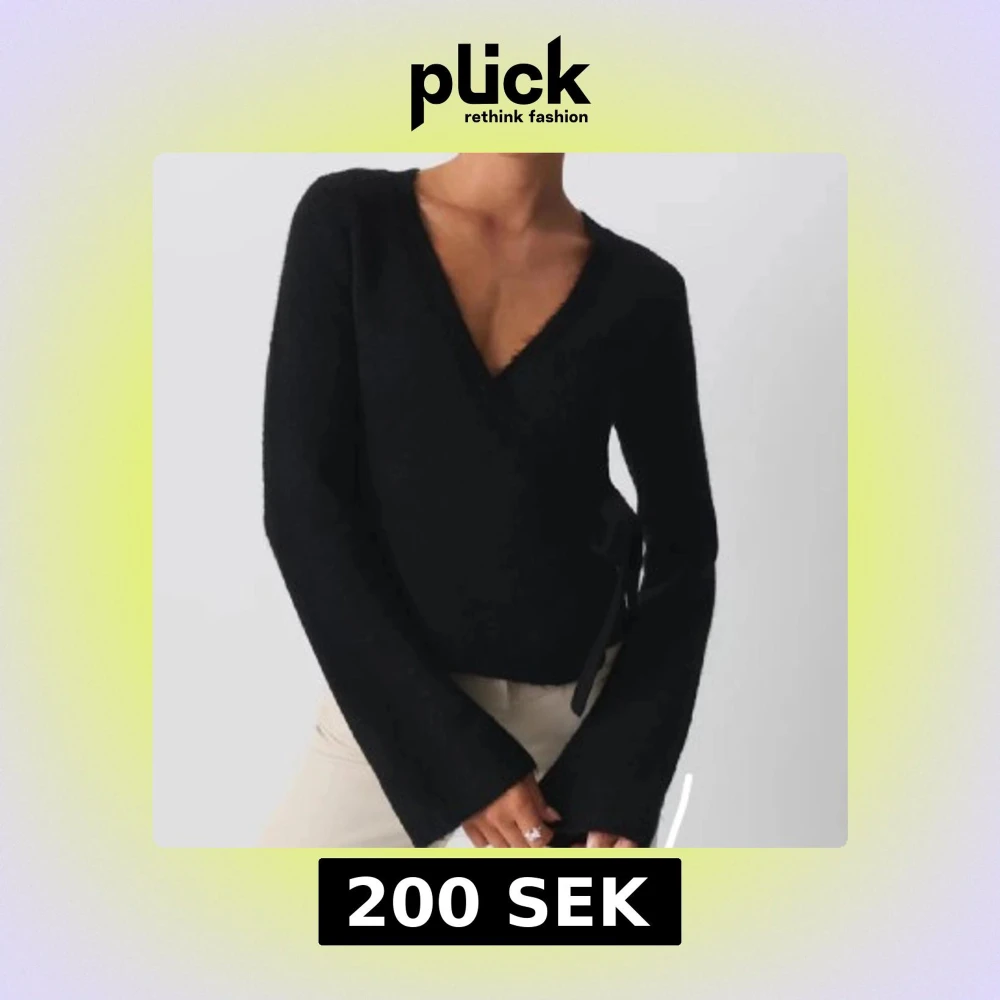Säljer en svart stickad tröja med omlottdesign och djup v-ringning. Tröjan har långa ärmar med lätt utsvängda ärmslut och knytning i sidan för en snygg detalj. Perfekt för lager på lager och en stilren look.