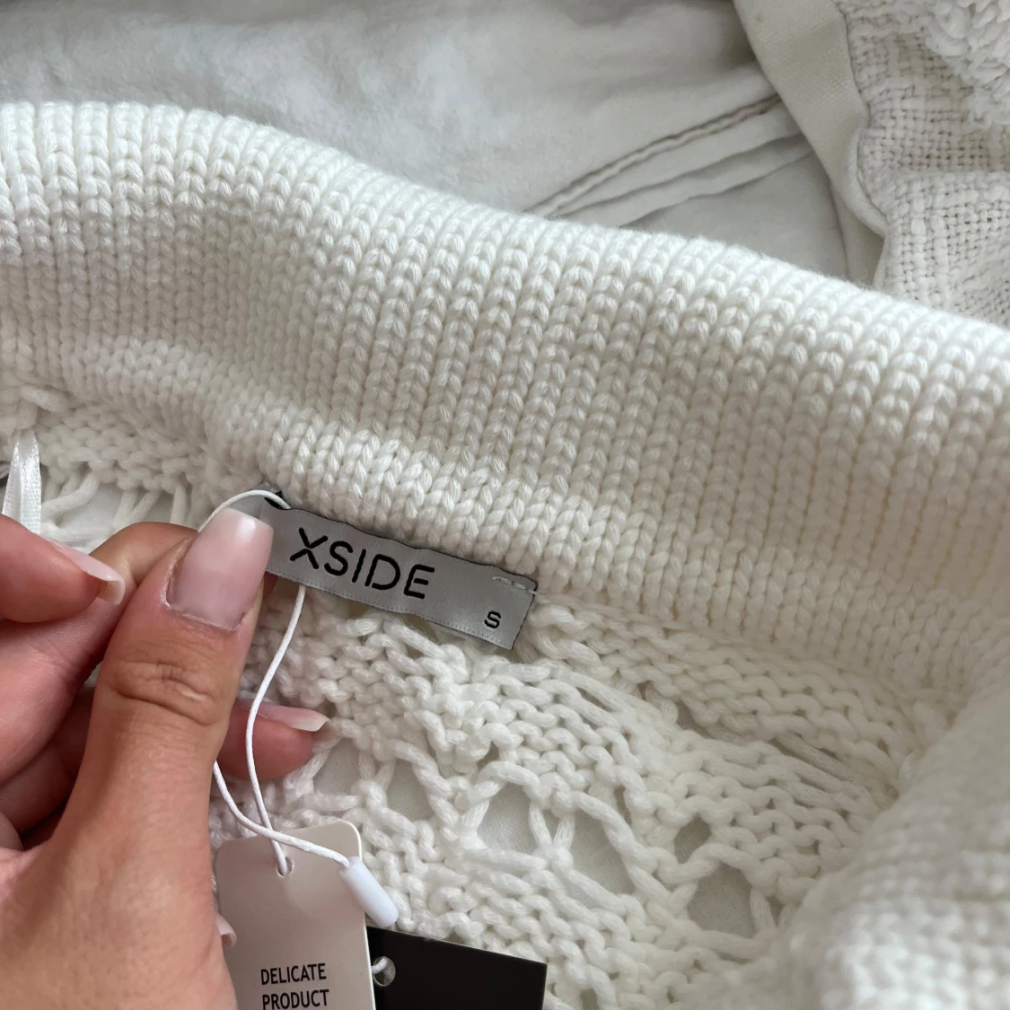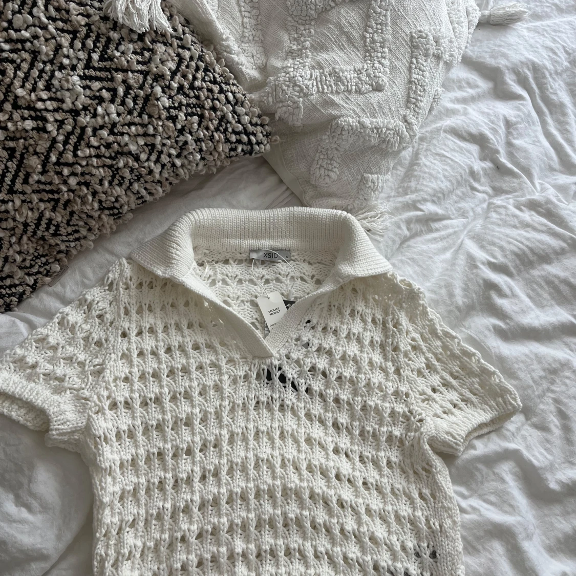 Säljer en vit stickad pikétröja från Xside i storlek S. Tröjan har korta ärmar, krage och ett luftigt hålmönster som ger en cool vibe. Perfekt för dig som gillar en chill och trendig stil. Materialet är mjukt och känns skönt mot huden. Prislappen är på.