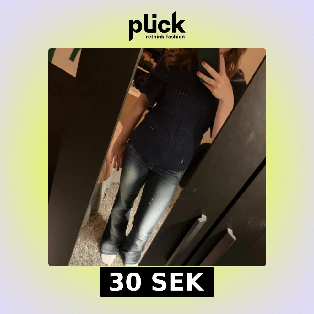 Säljer en mörkblå stickad tröja med offshoulder-design och korta ärmar. Tröjan har bred ribbad kant upptill som man kan ha lite som man vill bland annat offshoulder, stor polo eller boat neck 💗