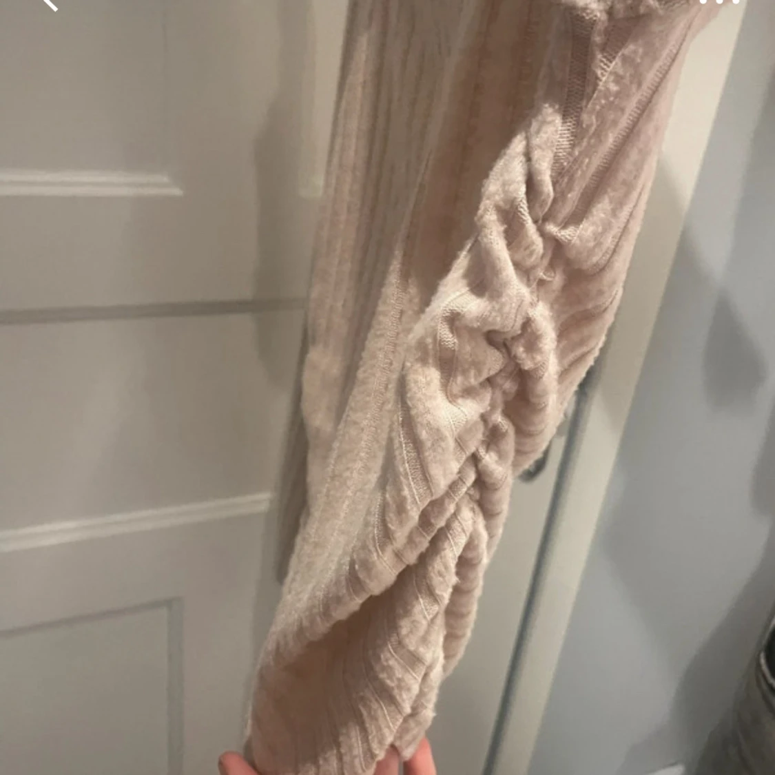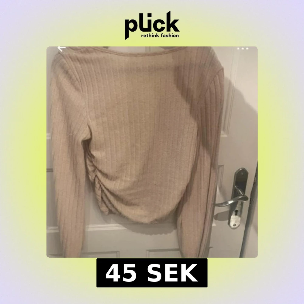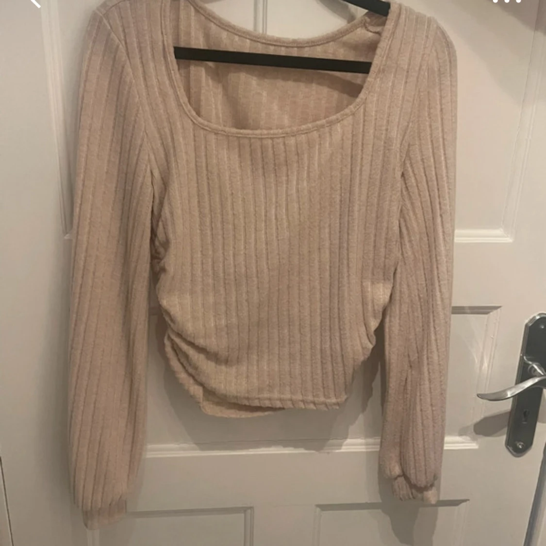 Säljer en beige ribbad tröja med lång ärm och snygg rynkdetalj på ena sidan. Tröjan har en fyrkantig ringning och är i ett mjukt, stretchigt material som sitter skönt på kroppen. Perfekt att styla med jeans eller kjol.