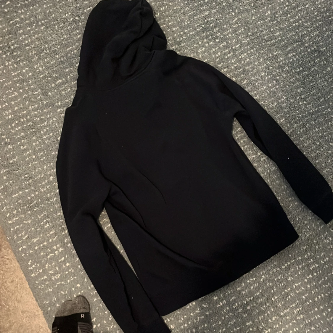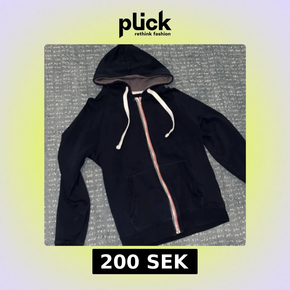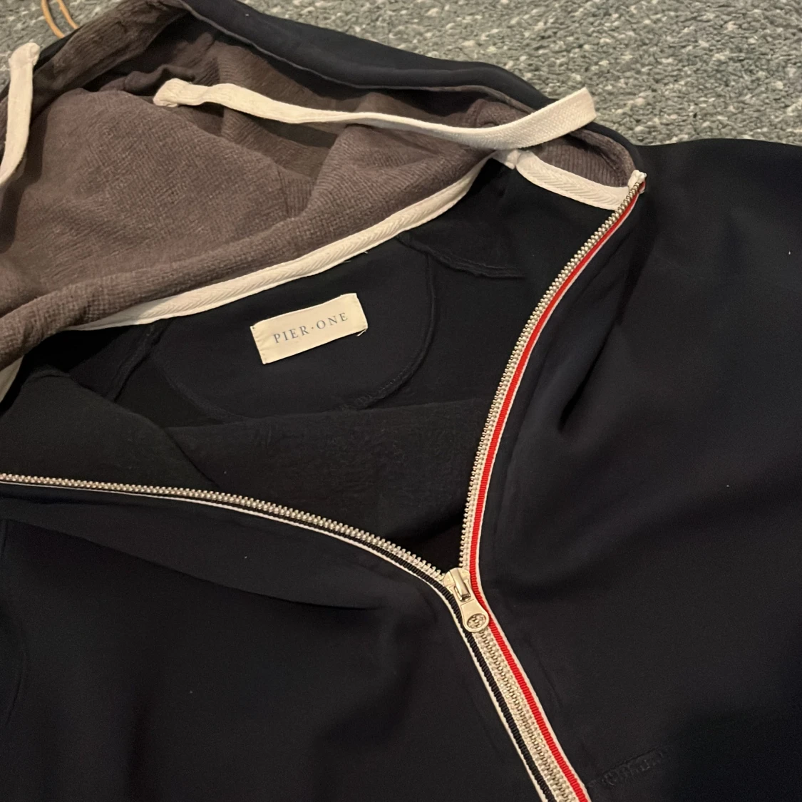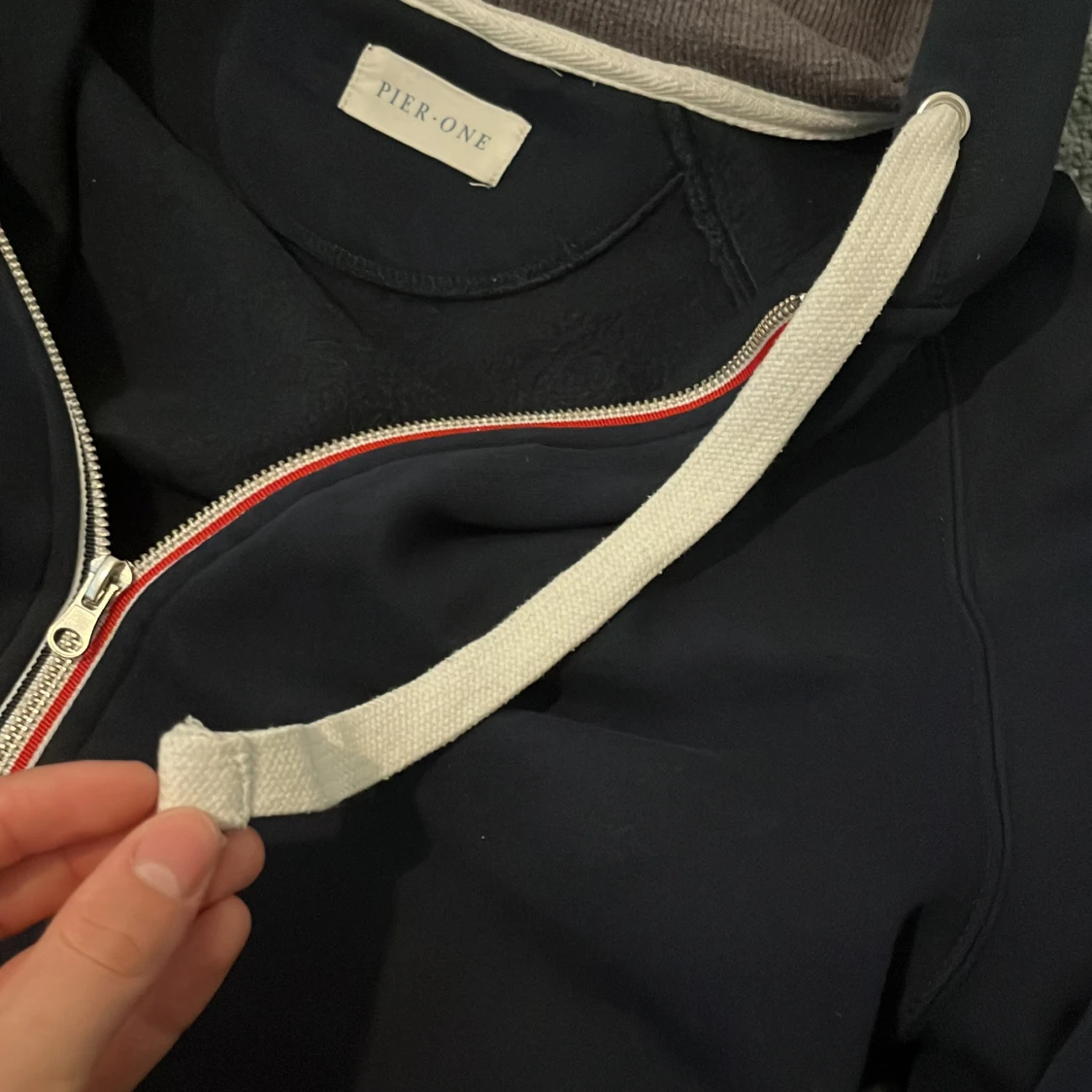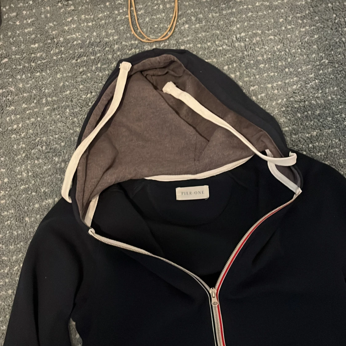 Mörkblå hoodie från Pier One med vit dragsko och hel dragkedja med röd och vit detalj. Tröjan har känguruficka framtill och mjukt grått foder i huvan. Perfekt för chill dagar eller när du vill ha en enkel och snygg look.