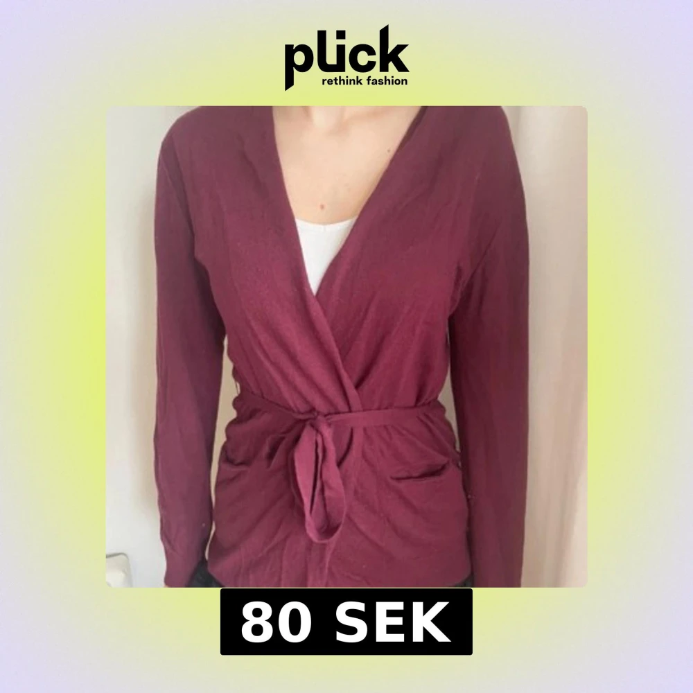 Säljer en vinröd omlottkofta med knytband i midjan och långa ärmar. Ganska tunt material.