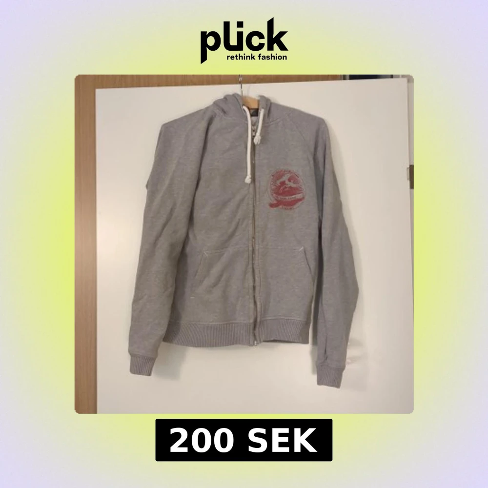 Grå hoodie med vit dragsko i huvan och röd logga på bröstet. Tröjan har hel dragkedja framtill, kängurufickor och ribbade muddar vid ärmslut och nederkant. Perfekt för chill dagar eller när du vill ha en avslappnad stil.