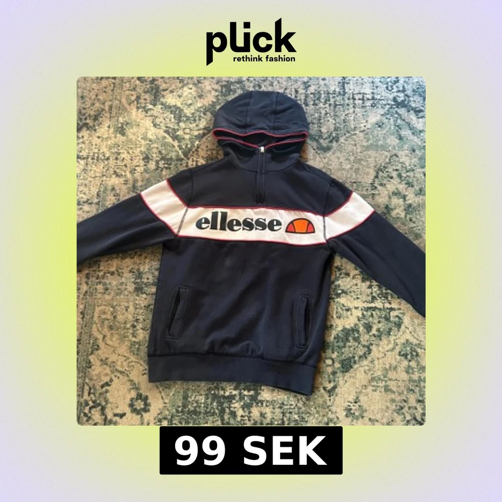 Säljer en mörkblå hoodie från Ellesse med vit och röd detalj över bröstet och stor logga. Tröjan har huva, dragkedja vid halsen och fickor framtill. Perfekt för en sportig och avslappnad stil.