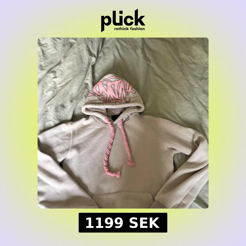 Säljer en beige hoodie från Syna world med rosa snörning och graffiti-inspirerat tryck på huvan. Tröjan är tillverkad i 100% bomull och har en klassisk loose passform med långärmade ärmar. Perfekt för dig som gillar streetwear och unika detaljer.