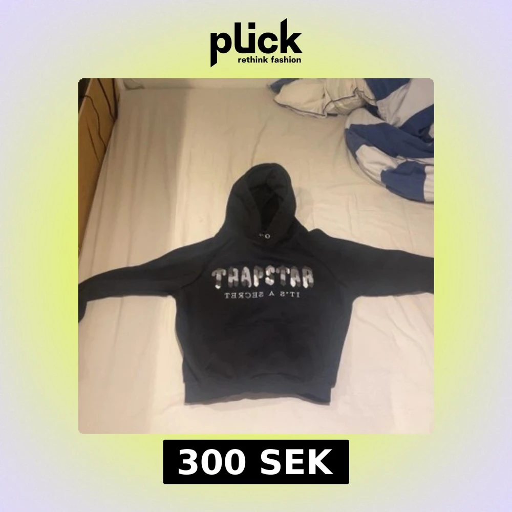 Svart hoodie från Trapstar med stor vit och grå logga på bröstet och texten 'IT'S A SECRET' under. Klassisk känguruficka framtill, huva med snörning och långa ärmar. Perfekt för dig som gillar streetwear och vill sticka ut med en snygg logga.