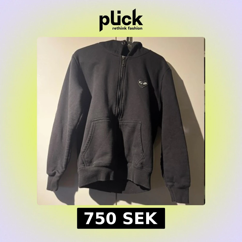 Svart hoodie från Comme des Garçons Play med halv dragkedja och ikoniskt hjärta med ögon på bröstet och stort tryck på ryggen. Mjuk bomull, känguruficka och ribbade muddar. Perfekt för dig som gillar streetwear och stilrena detaljer. Storlek S men passar M. Använd endast 2 gånger.