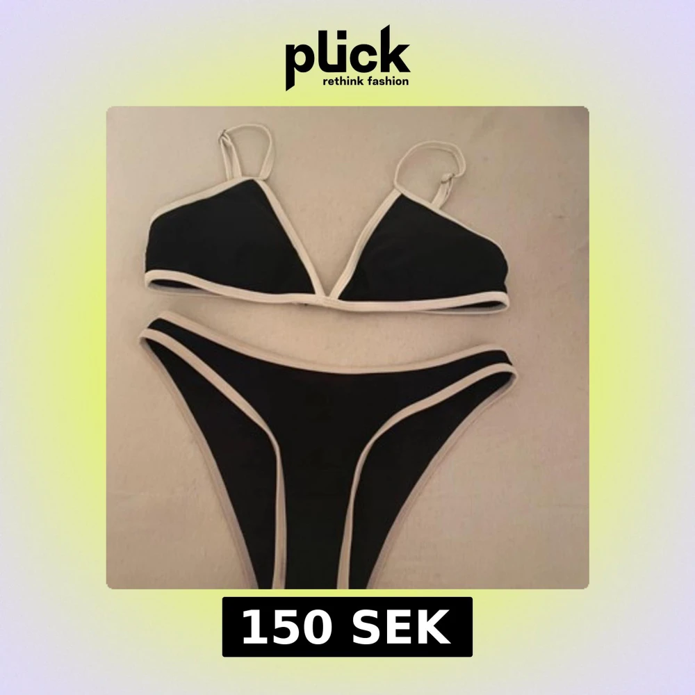 Snygg svart bikini med vita kontrastkanter. Överdelen har smala axelband och trekantsform, medan underdelen har hög midja och smala sidor. Perfekt för stranden eller poolen i sommar!