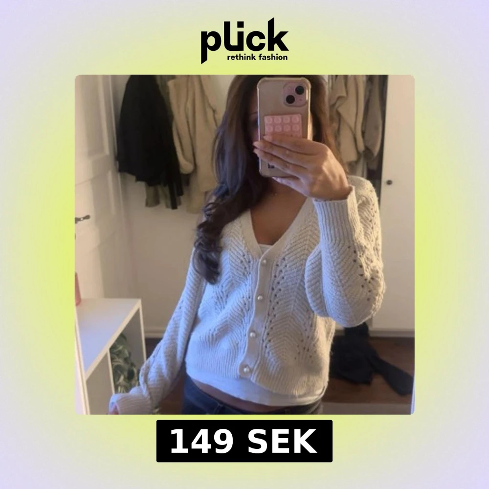 Superfin vit stickad kofta med v-ringning och pärlknappar framtill. Koftan har ett snyggt hålmönster och ribbade muddar vid ärmslut och nederkant. Perfekt att slänga över ett linne för en chill look. Köpt på sellpy för 249kr