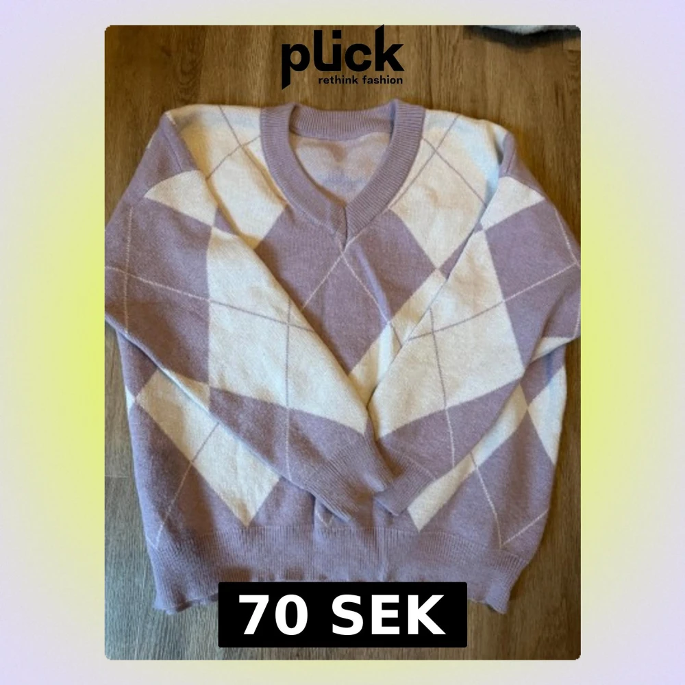 Säljer en mysig stickad tröja med v-ringning i ljuslila och beige. Tröjan har ett klassiskt rutmönster med ribbade muddar vid hals, ärmslut och nederkant. Perfekt för dig som gillar preppy vibes och vill ha något mjukt och snyggt till hösten.