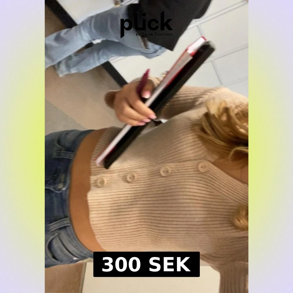 Säljer en beige ribbad kofta med v-ringning och tre stora knappar framtill. Koftan är croppad och har långa ärmar, perfekt för dig som gillar en chill och snygg stil. Passar till både jeans och kjol för en trendig look.