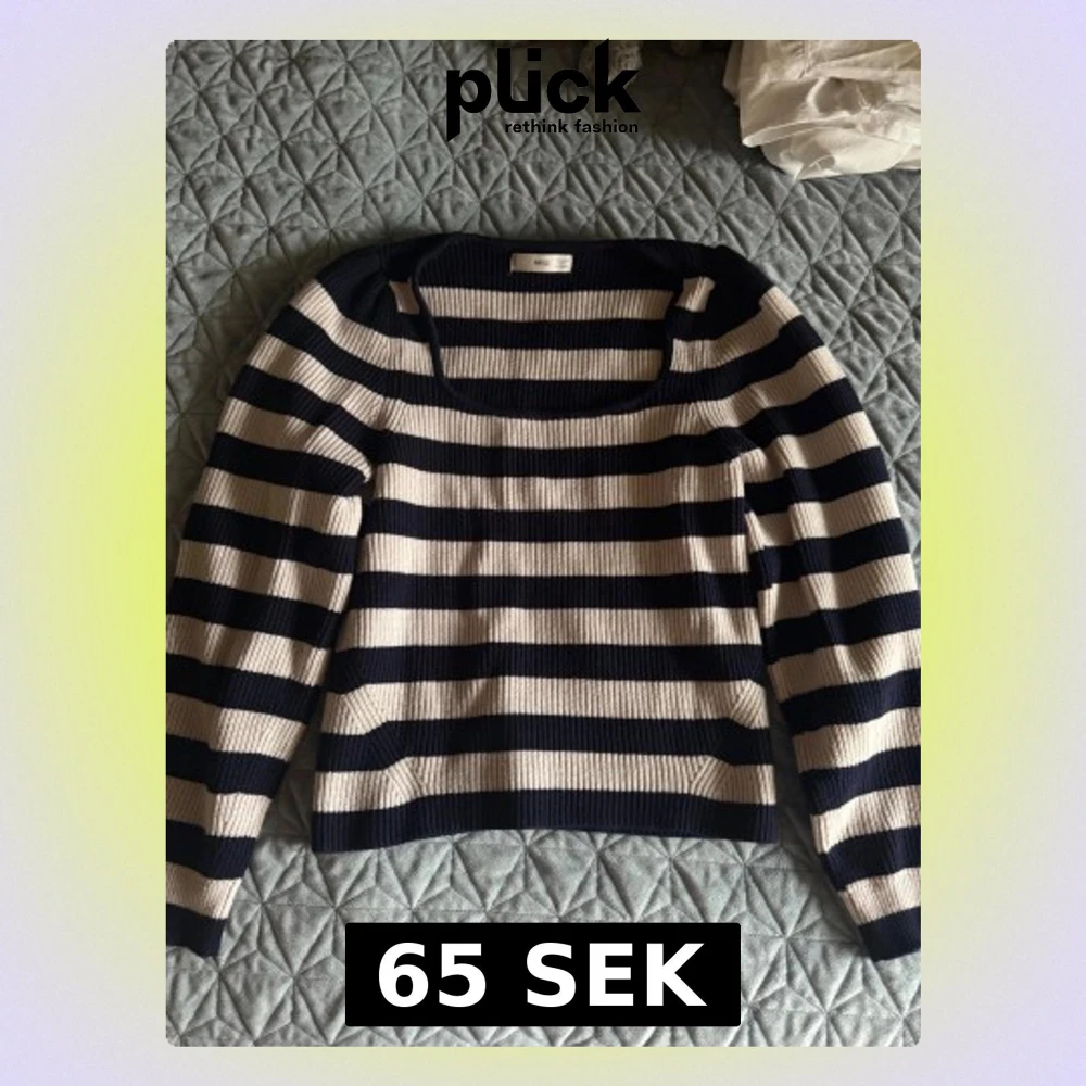 Säljer en ribbstickad tröja från MNG med breda marinblå och beige ränder. Tröjan har fyrkantig ringning, lång ärm och är i ett mjukt stickat material. I fint skick