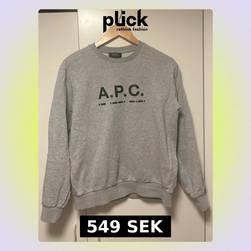 Snygg grå sweatshirt från A.P.C. med svart logotyptryck på bröstet. Tröjan har rund halsringning, ribbade muddar vid ärmslut och nederkant samt en avslappnad passform. Perfekt för en clean och stilren look.