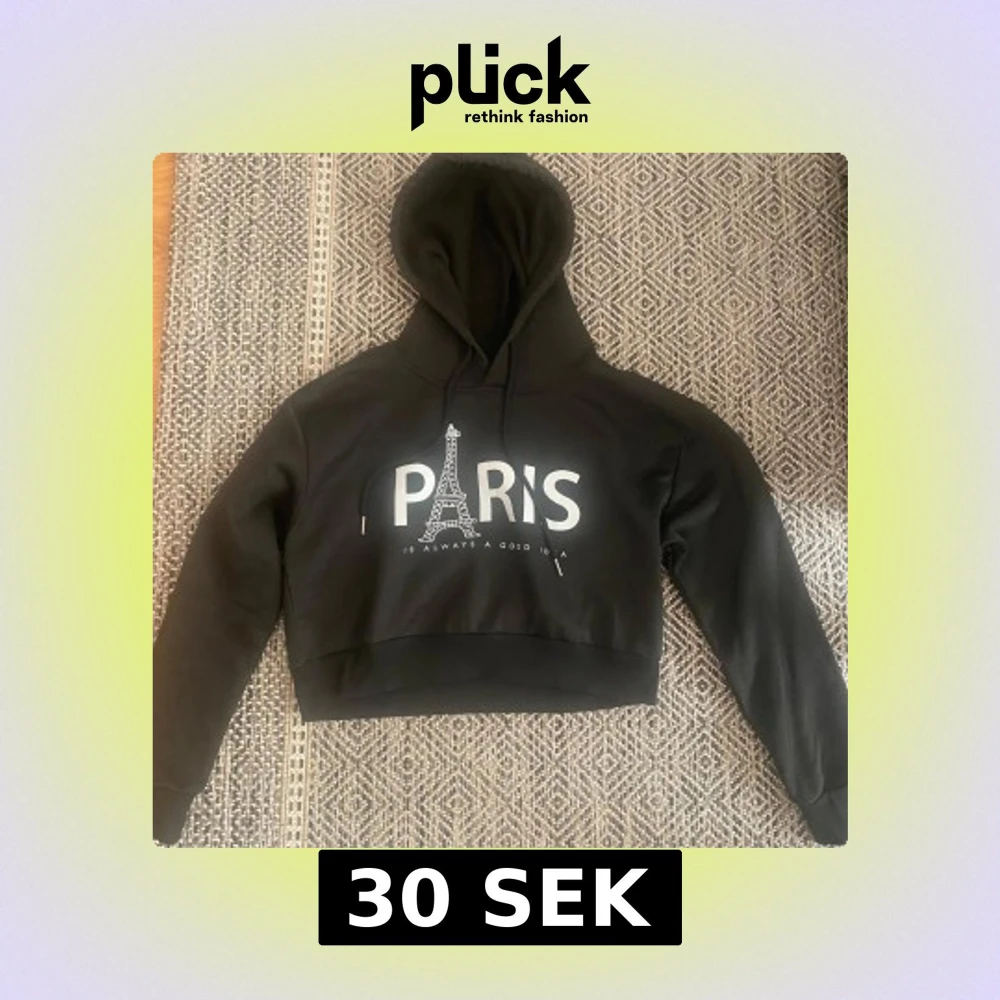 Säljer en svart croppad hoodie från Shein med texten 'Paris' och Eiffeltornet tryckt på framsidan. Hoodien har långa ärmar och en bekväm huva.