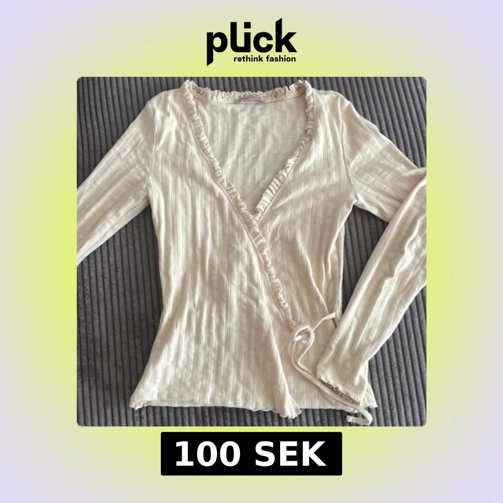 Säljer en stilren beige omlottopp med volangdetaljer längs den v-ringade halsen. Toppen har långa ärmar och ett knytband i midjan för en justerbar passform. Perfekt för en chic och avslappnad look.