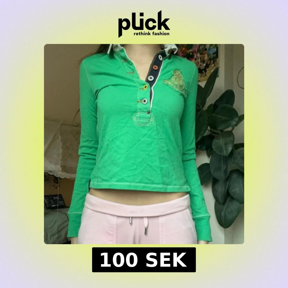 Säljer en grön långärmad pikétröja från Polo Jeans med knappar och broderad logga på bröstet. Tröjan har en kontrasterande krage och detaljer i rosa och guld. Även gjord i 100% bomull : )