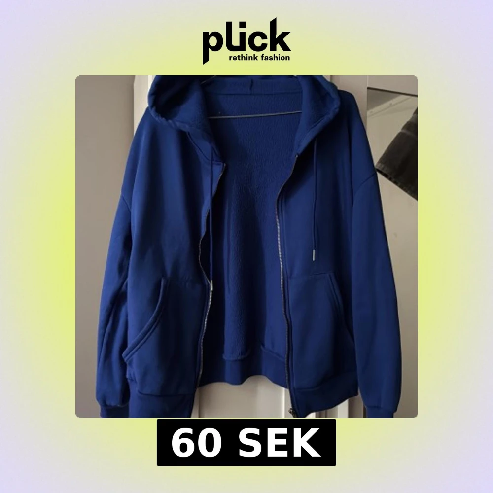 Säljer en blå hoodie med dragkedja och huva. Tröjan har stora fickor framtill och ribbade muddar vid ärmslut och nederkant. Oversized passform som är perfekt för en chill och avslappnad stil. Materialet känns mjukt och skönt mot huden.