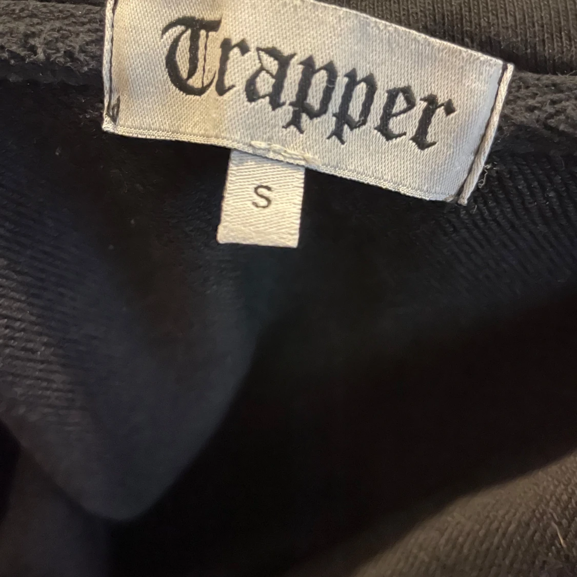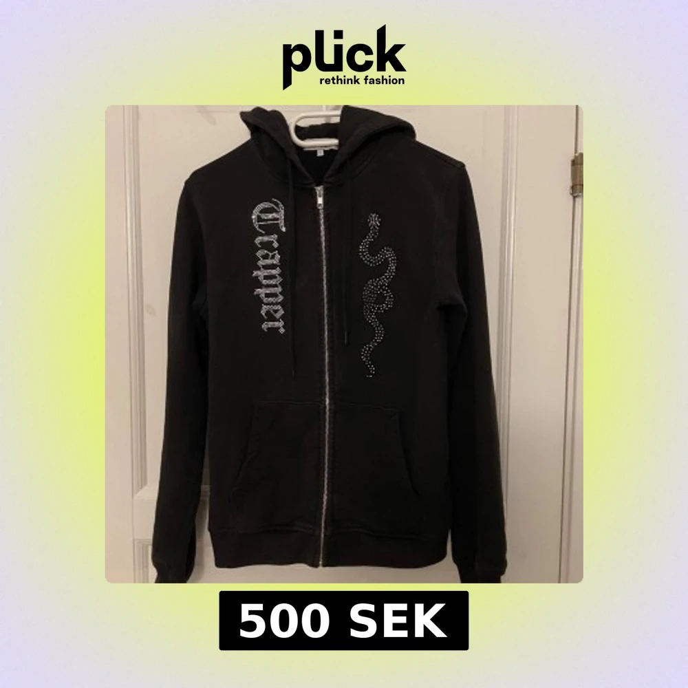 Svart hoodie från Trapper med dragkedja, huva och fickor. Dekorerad med strasstenar i form av en orm och texten 'Trapper' på framsidan. Perfekt för en cool och avslappnad stil.