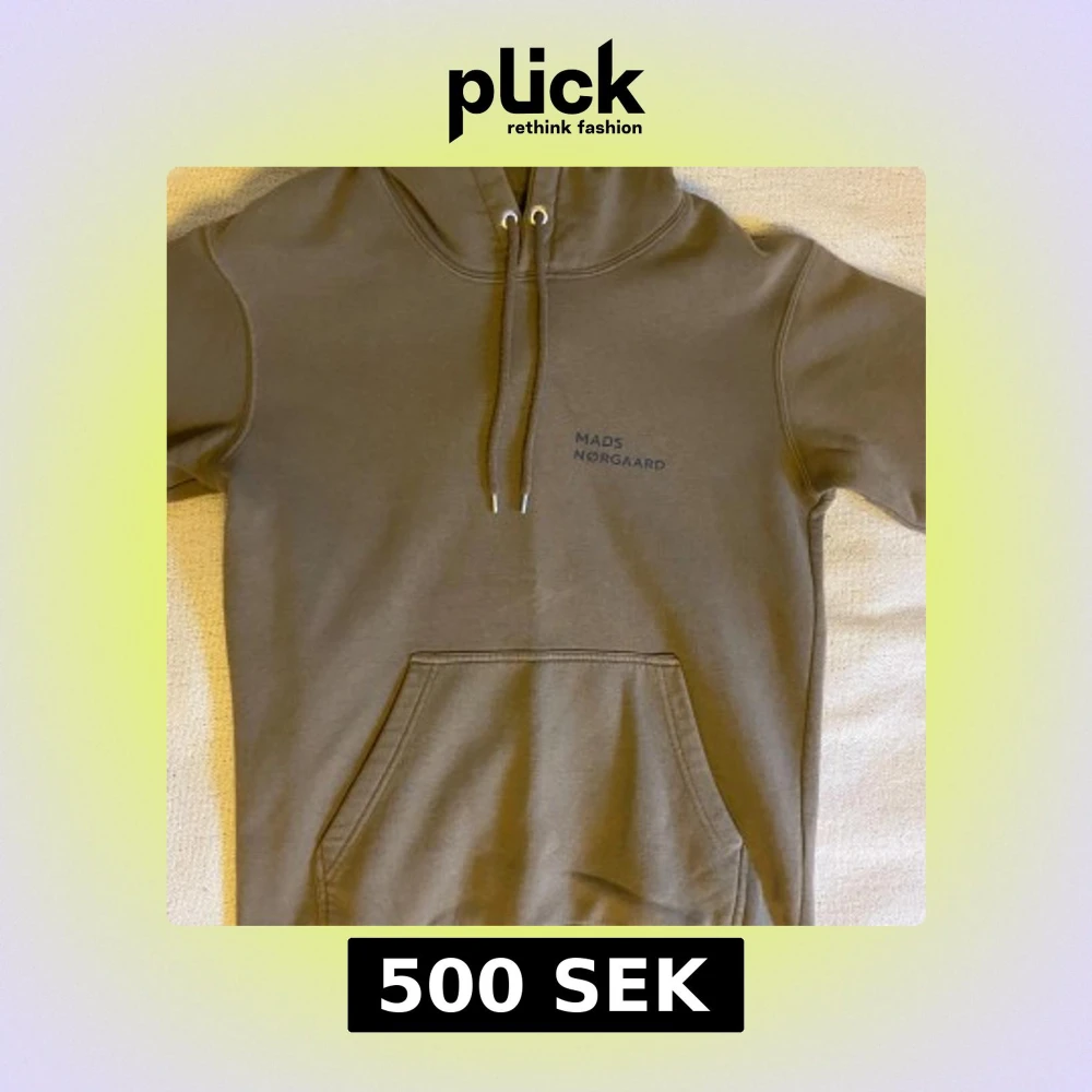 Jag säljer en olivgrön hoodie i storlek S från Mads Nørgaard med diskret logga på bröstet. Tröjan har huva med dragsko och en stor magficka framtill. Liten fläck på magfickan.