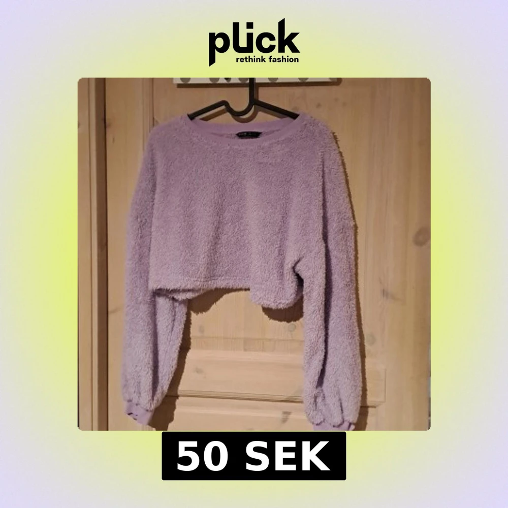 Mysig lila croppad tröja från Shein i ett fluffigt material. Tröjan har långa ärmar och ribbade muddar vid ärmslut och hals. Perfekt för en avslappnad stil.