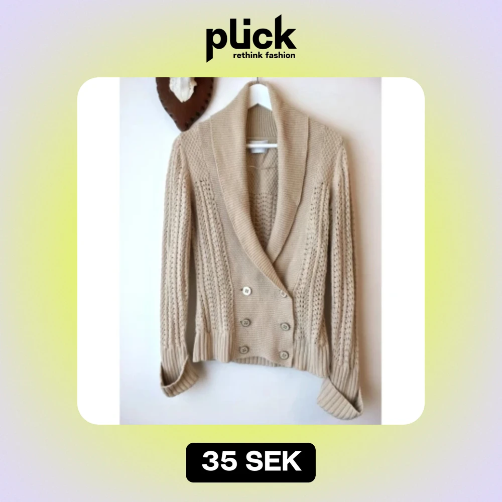 Beige dubbelknäppt kofta från Stockh lm. Stora uppvikta muddar vid ärmarna och sjalkrage. Tecken på användning finns då koftan är aningen urtvättad. Mått får ej plats - fråga gärna!