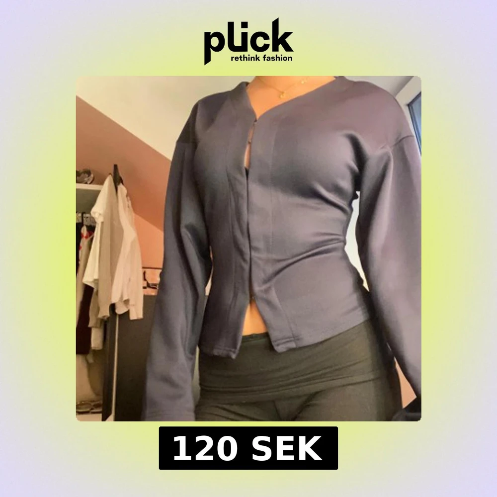 Säljer en mörkblå, figursydd topp med v-ringning och långa ärmar. Koftan har en clean look utan synliga knappar och är tillverkad i ett mjukt, stretchigt material som sitter snyggt på kroppen.