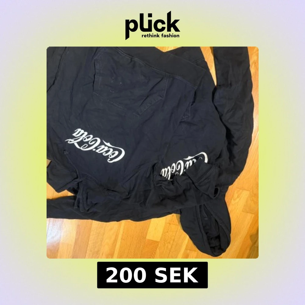Svart hoodie med stor vit Coca-Cola-logga på framsidan. Tröjan har huva, lång ärm och en klassisk känguruficka. Perfekt för dig som gillar streetwear och vill sticka ut med en ikonisk logga. Säljer 2 för 200
