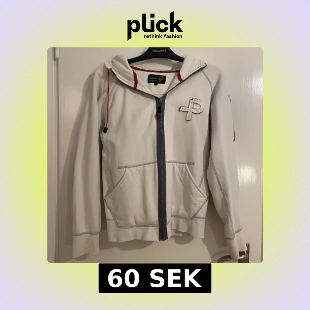 Vit hoodie från Pelle P med grå kontrastsömmar, hel dragkedja och huva med röd snörning. Stort P-logga på bröstet och broderad detalj på ärmen. Praktiska fickor framtill och sportig känsla. Perfekt för chill eller utomhusaktiviteter.
