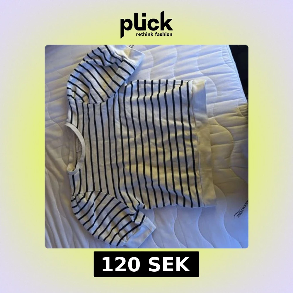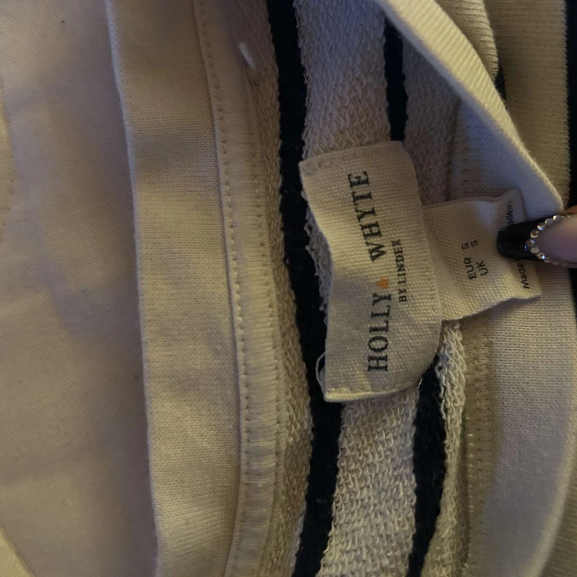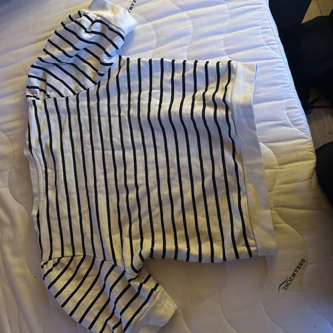 Superfin vit tröja med svarta ränder från Holly & White. Tröjan har puffiga korta ärmar och bred mudd nertill för en trendig look. Perfekt till jeans eller kjol och passar året runt. Gjord i mjuk bomull som känns skön mot huden.