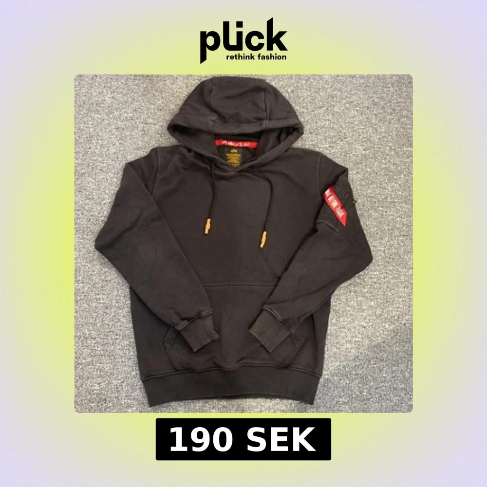 Svart hoodie från Alpha Industries med stor logga på ryggen. Vid frågor eller funderingar hör av dig!