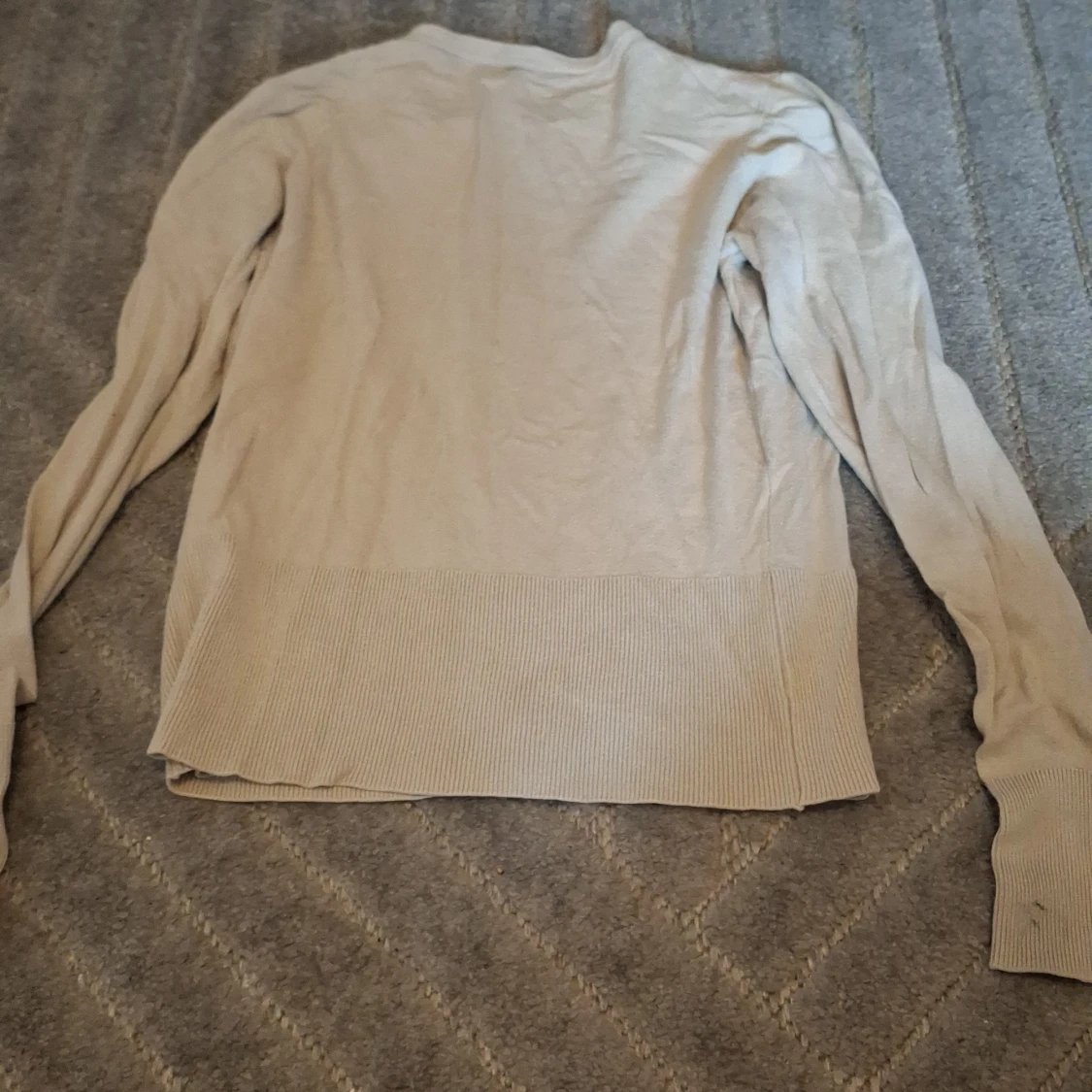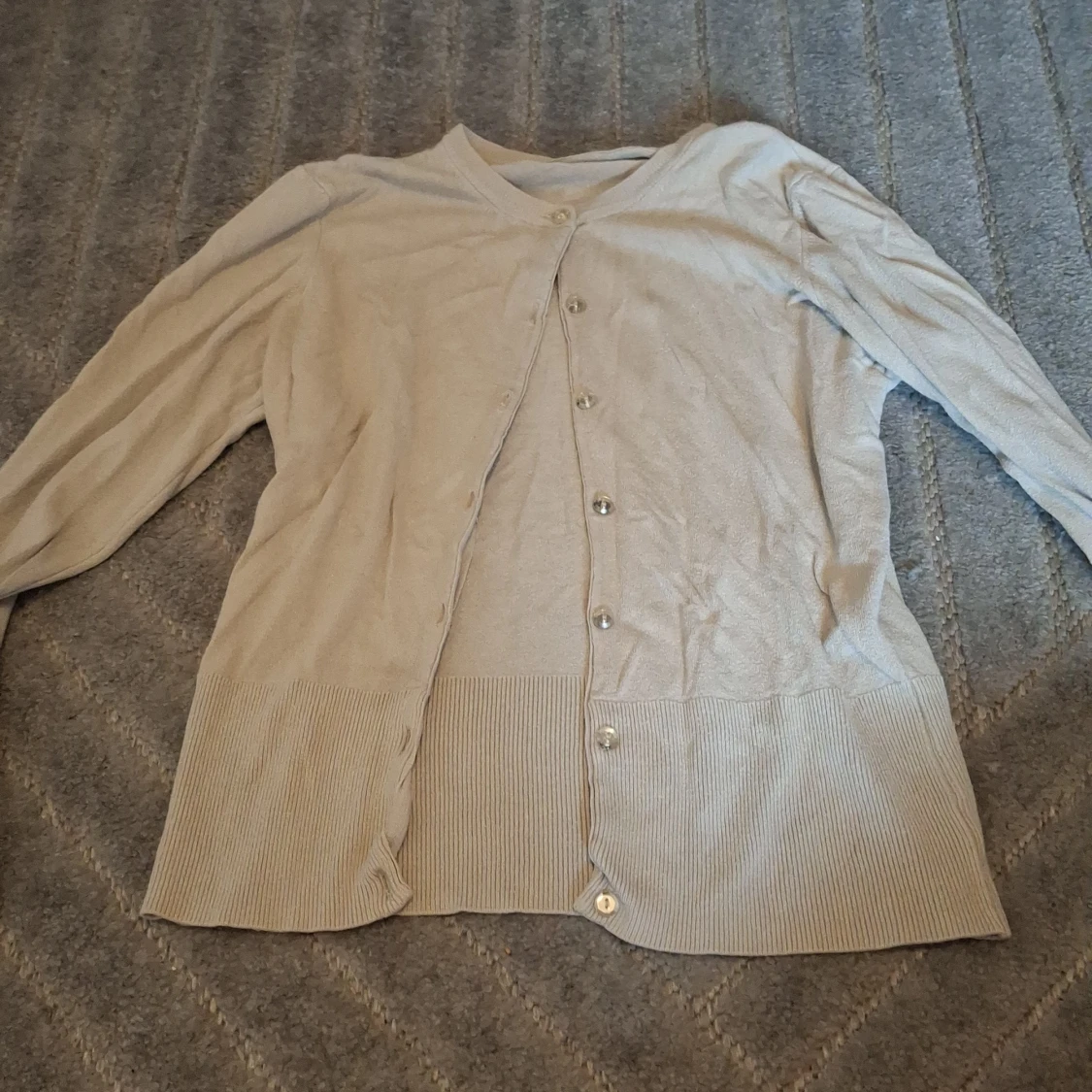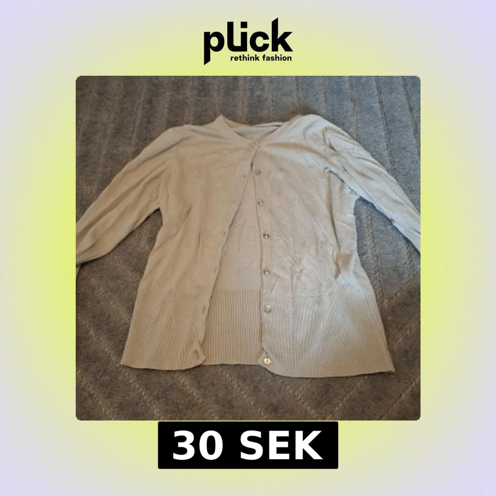 En stilren beige kofta med långa ärmar och knappar framtill. Koftan har ribbade muddar och nederkant, vilket ger en snygg och enkel look. Perfekt att slänga på sig över en t-shirt eller linne för en chill och clean stil.