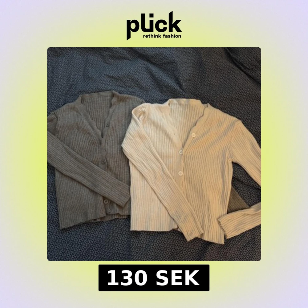 Två ribbade koftor i beige och grå med knappar framtill. Perfekta för lager-på-lager under kyligare dagar. De har en v-ringad design och långa ärmar. 130kr för bägge!
