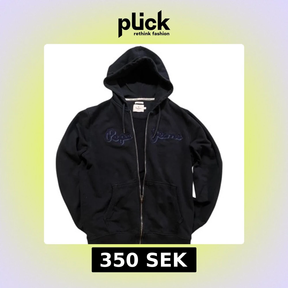 Säljer en svart hoodie från Pepe Jeans med dragkedja och broderad logga på bröstet. Den har en justerbar huva med snören och praktiska fickor framtill. Perfekt för en avslappnad stil.