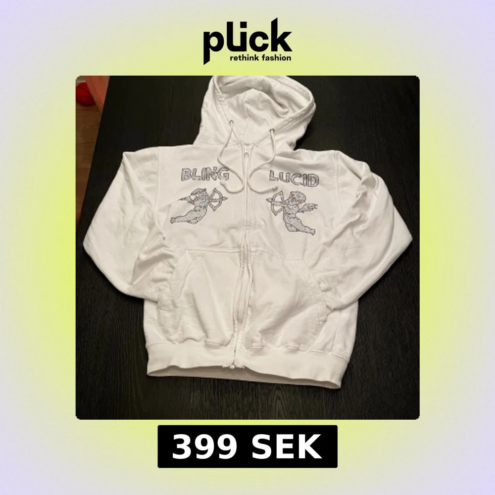 Vit hoodie från Bling Lucid med strassdetaljer och texten 'BLING LUCID' på bröstet. Två änglar i strass pryder framsidan. Tröjan har huva med snörning, dragkedja och fickor framtill. Materialet är 80% bomull och 20% polyester.