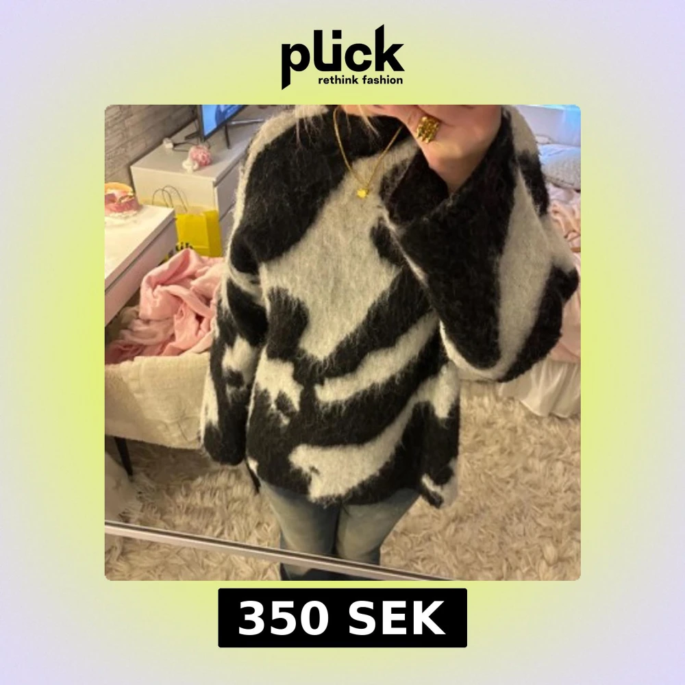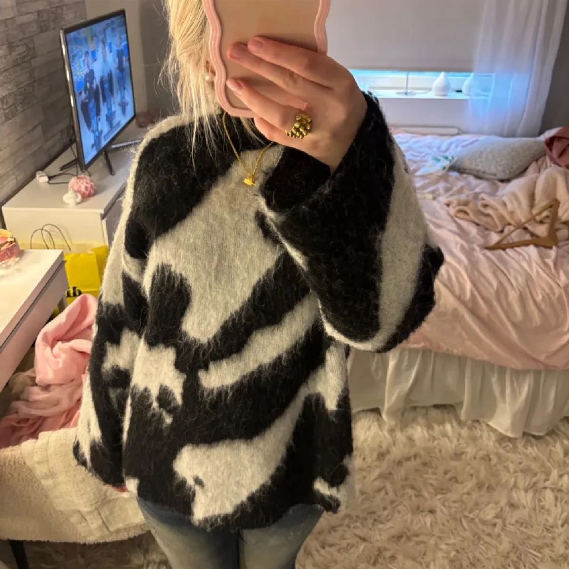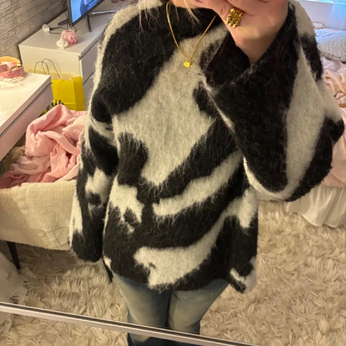Säljer en oversized, fluffig stickad tröja i svart och vitt med coolt mönster. Tröjan har lång ärm och är supermjuk, perfekt för att mysa i under kyliga dagar. Passar dig som gillar en avslappnad och trendig stil.