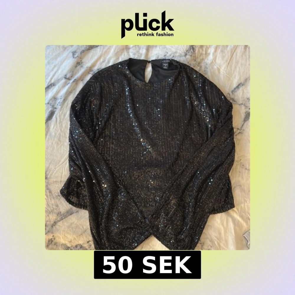 Glittrig svart blus från Amisu i storlek S, täckt med paljetter som ger en riktigt festlig vibe. Blusen har rund hals och långa ärmar, perfekt för att sticka ut på nästa party eller event. Snyggt nyckelhål bak i nacken för extra detalj.