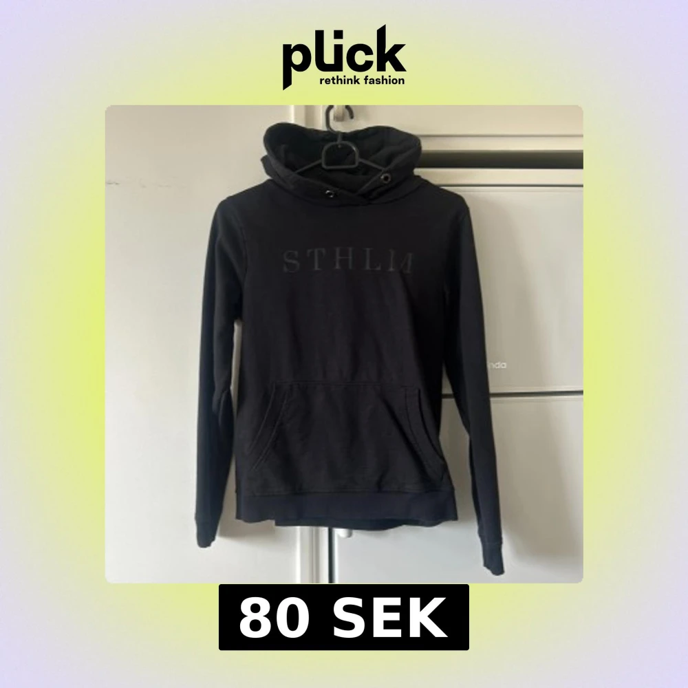 Svart hoodie med trycket 'STHLM' på bröstet. Tröjan har huva med dragsko och en stor magficka framtill. Långa ärmar och mjukt material gör den perfekt för kyligare dagar.