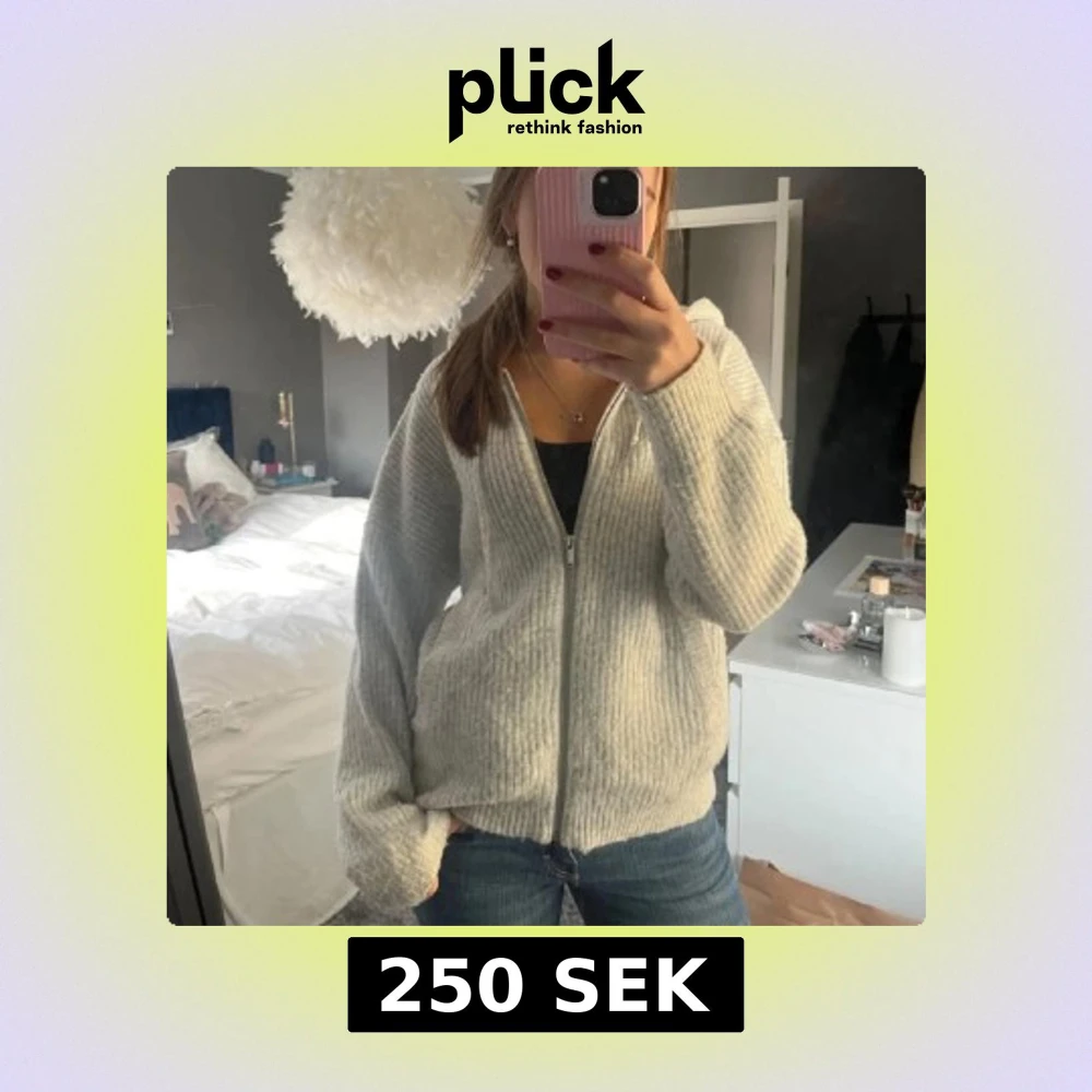 Mysig grå stickad kofta med dragkedja framtill.