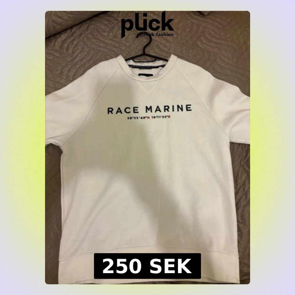 Säljer en stilren vit sweatshirt från Race Marine med tryck i svart och röda detaljer på bröstet. Tröjan har rund halsringning och korta ärmar, perfekt för en avslappnad look. Tillverkad i mjuk bomull för skön komfort.