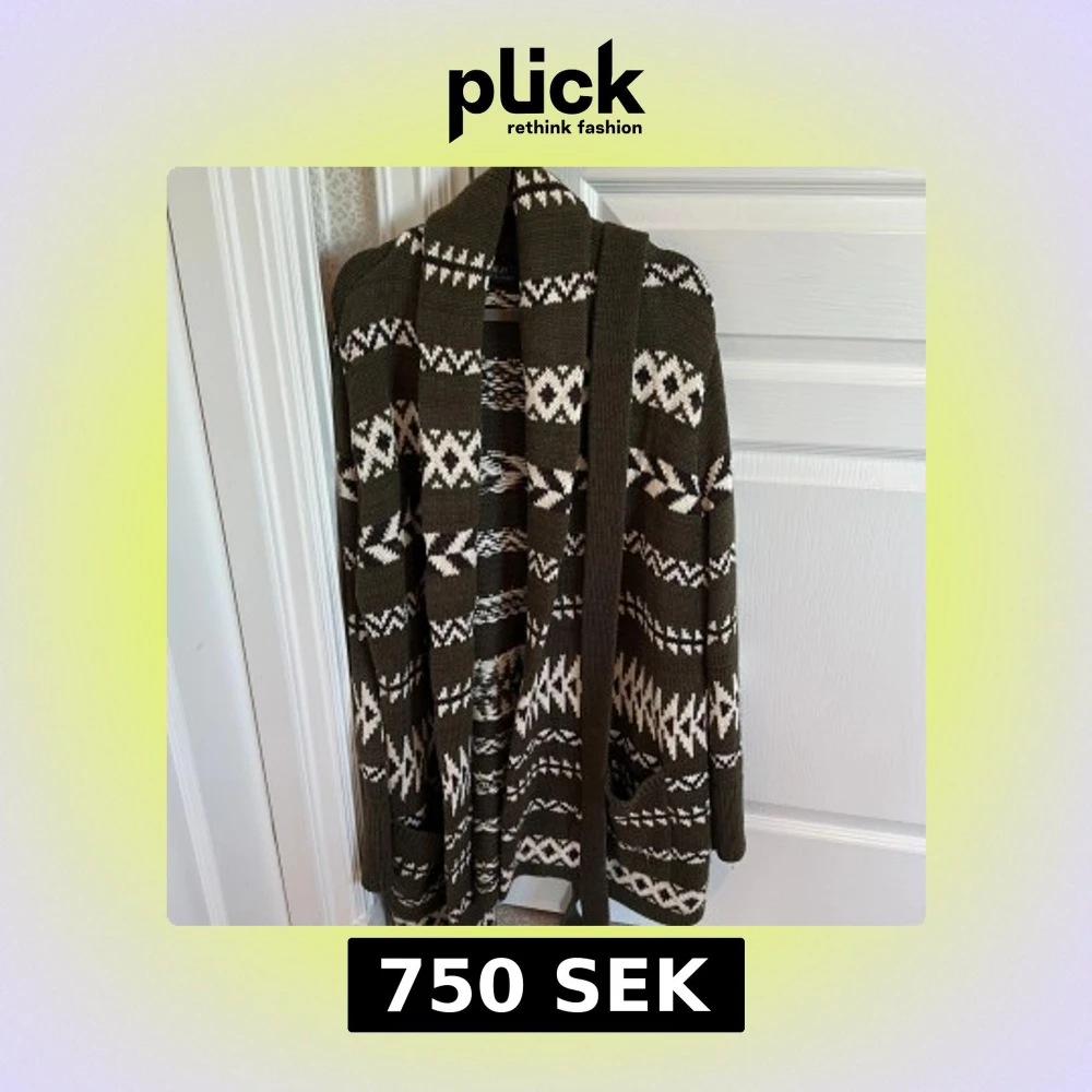 Säljer en mysig kofta i grönt med vitt mönster. Koftan har långa ärmar och ett knytband i midjan. Perfekt för kyliga dagar!