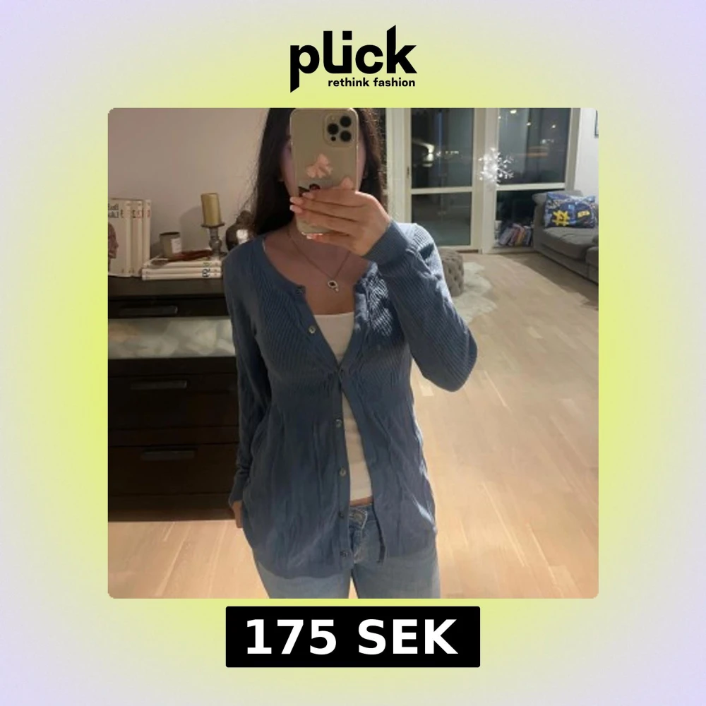 Snygg blå kofta med långa ärmar och knappar framtill. Den har ett diskret ribbat mönster och är perfekt för lager-på-lager-stil. Passar bra till både jeans och kjol.