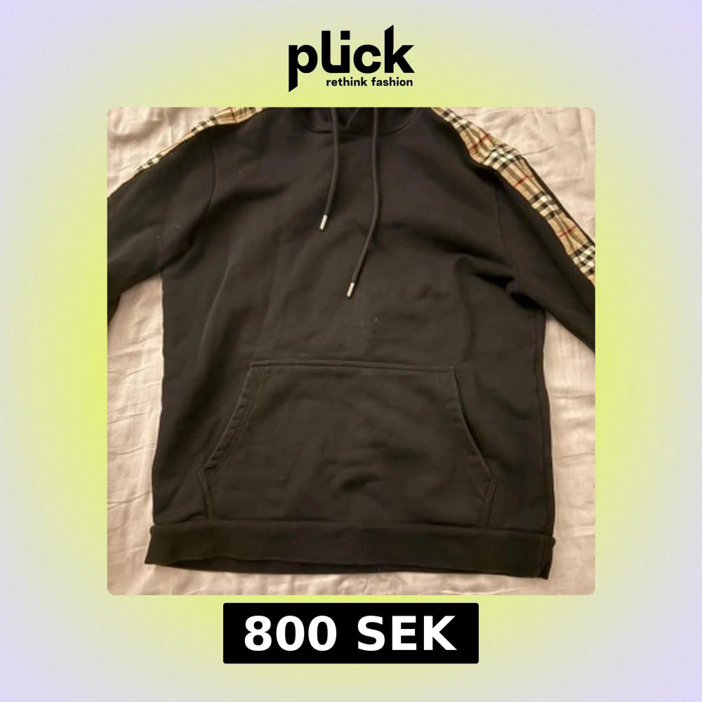 Svart hoodie med klassiska rutiga band längs axlarna och huva med snörning. Stor magficka framtill och ribbade muddar. Perfekt för dig som gillar streetstyle och vill ha en snygg detalj på din tröja.